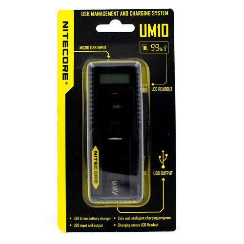 The Nitecore UM10 Charger is a multifunctioning charger compatible with an abundance of Li-Ion battery types. The LCD display provides you with your batteryÕs informational data. This is an all-around premium charger. It is fire-retardant, durable, and conveniently sleek and portable.