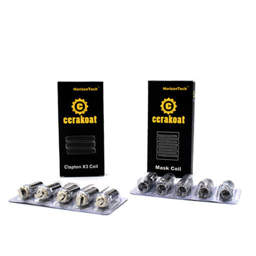 The Horizon Cerakoat Replacement Coil family consists of two distinct coil configurations, with the Mask coil utilizing a very unique fused flat ring system that covers the wicking surface area in a more efficient manner alongside a Clapton X3 coil that presents a highly efficient and unique heating pattern.