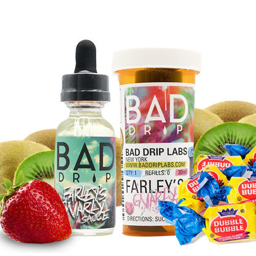FarleyÕs Gnarly Sauce by Bad Drip is the flavor combination of fresh strawberries, juicy kiwis, and bubblegum. Made by Bad Drip Labs to give you love at first vape.