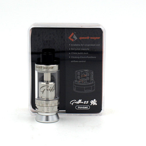 The GeekVape Griffin 25 RTA comes with a multitude of features! It has been upgraded to now feature a top airflow control which helps with the production of massive vapor clouds. The RTA has its very own one of a kind juice flow control that allows for more personalized flavor and wicking enhancements. A top-fill method is also offered with the Griffin 25. This makes for convenient and quick filling while also reducing any leaks from occurring.
